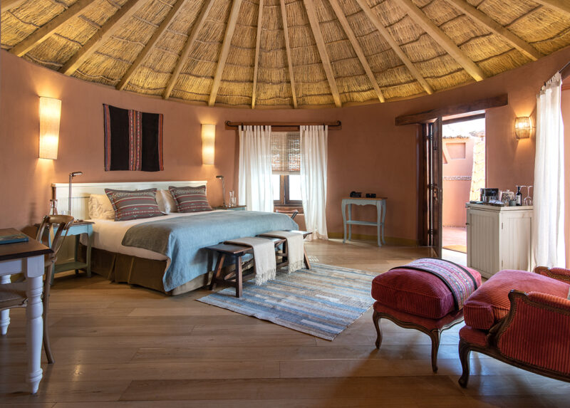 Os quartos têm dois formatos: a Superior Round Suite e o Round Room, ambos circulares, com piso de madeira polida, paredes de adobe, banheiros espaçosos com banheira de mármore, aquecedor de toalhas, ducha interna e externa, e um pátio privativo a céu aberto. Cada suíte é uma unidade independente, o que garante um nível de privacidade que hotéis convencionais raramente conseguem oferecer.