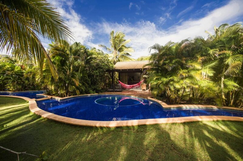 O estilo é contemporâneo com muita alma tropical: são 30 bangalôs espalhados por um terreno de 26 mil metros quadrados de área verde, onde saguis aparecem de vez em quando e o som da natureza toma o lugar do barulho de cidade. Cada bangalô tem varanda com rede, banheira para dois, lençóis 100% algodão, ar-condicionado split e frigobar. Os mais especiais contam com piscina privativa — um convite difícil de recusar. A Praia do Amor e a Praia das Minas ficam a apenas 500 metros a pé.