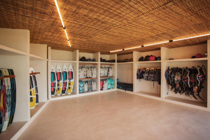 Aqui, o hóspede pode trocar o equipamento diariamente conforme o vento — uma experiência sob medida para quem vive o esporte.