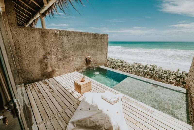 Localizadas sobre a praia, as Jaobi Villas também possuem piscina de borda infinita e aquecida por energia solar, com uma média de 26°C. As villas oferecem um ambiente interno espaçoso com sala de estar, jardim interno com chuveiro, suíte master com cama king size, closet e um ofurô externo. A infraestrutura inclui TV LCD, cofre, frigobar, ar-condicionado e conexão USB, tudo pensado para garantir uma estadia exclusiva.