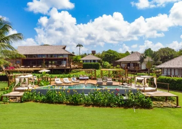 Todas as acomodações estão suspensas por palafitas e dispostas em formato de U, voltadas para a Baía do Sueste. A decoração mistura brasilidade, arte e materiais naturais, criando ambientes que inspiram calma.
