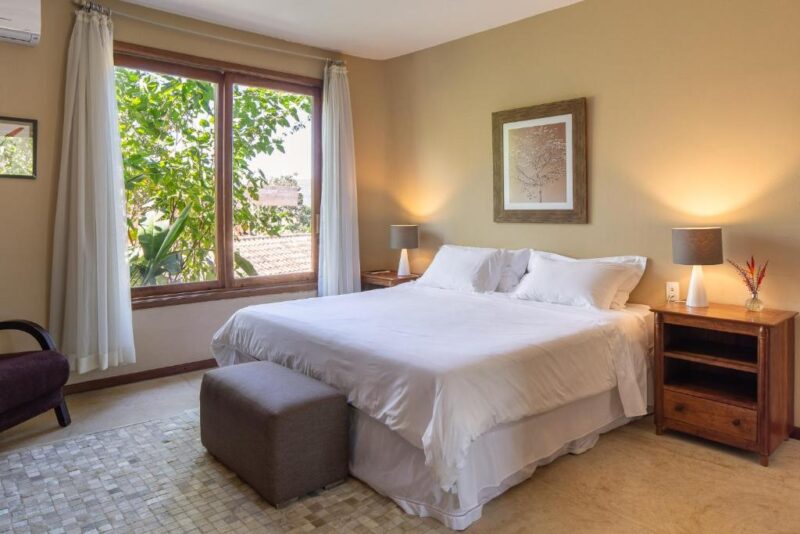 Iluminada e agradável, a Suíte Leela oferece cama queen, banheira e varanda térrea. Uma opção aconchegante para casais que buscam conforto em um ambiente sereno.