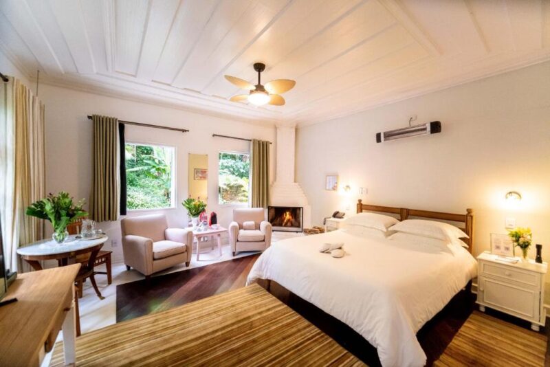 A gastronomia é outro ponto alto. O restaurante Pau e Pedra funciona em um casarão com vigas de madeira antigas e uma grande pedra aparente que dá nome ao espaço. O cardápio privilegia ingredientes frescos, locais e sazonais, preparados com calma e servidos em um ambiente que reforça a experiência sensorial do lugar. O café da manhã, servido até as 16h, é quase um ritual: pães quentinhos, frutas frescas e receitas caseiras que podem ser apreciadas sem pressa, no salão ou na privacidade da sua casa.