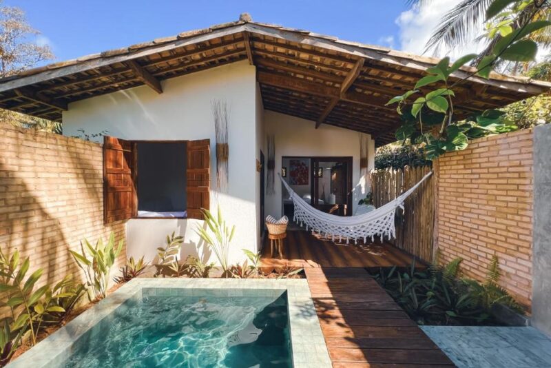 A pousada está diante de uma praia praticamente deserta, cercada por coqueiros e uma extensa faixa de areia branca e fina. São apenas nove bangalôs, o que garante silêncio, privacidade e uma atmosfera verdadeiramente acolhedora. Um deque à beira-mar convida à contemplação, enquanto piscina, redes espalhadas pelo jardim, cantinho de massagem, restaurante integrado à paisagem e uma charmosa sala de leitura completam o cenário.
