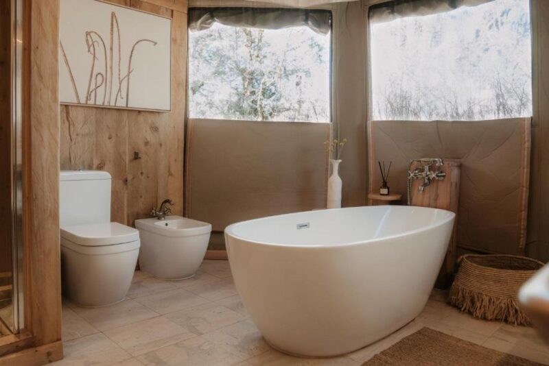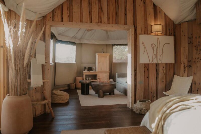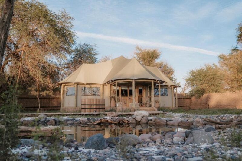 São sete Luxury Tents dispostas em pleno deserto, cada uma com banheiro privativo completo (banheira de imersão, ducha rain shower, bidê), lençóis Frette, minibar, lareira, ar-condicionado e terraço privativo com vista direta para o Volcán Licancabur. As tendas Suite foram desenhadas para casais, com quarto, sala de estar integrada e glam room com closet e penteadeira. A tenda Family acomoda até quatro pessoas em dois quartos. Todas têm jardim com lago e cascata. O funcionamento é 100% movido a energia solar, com sistema de reciclagem de água no deserto mais árido do mundo.
