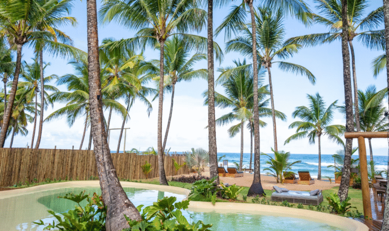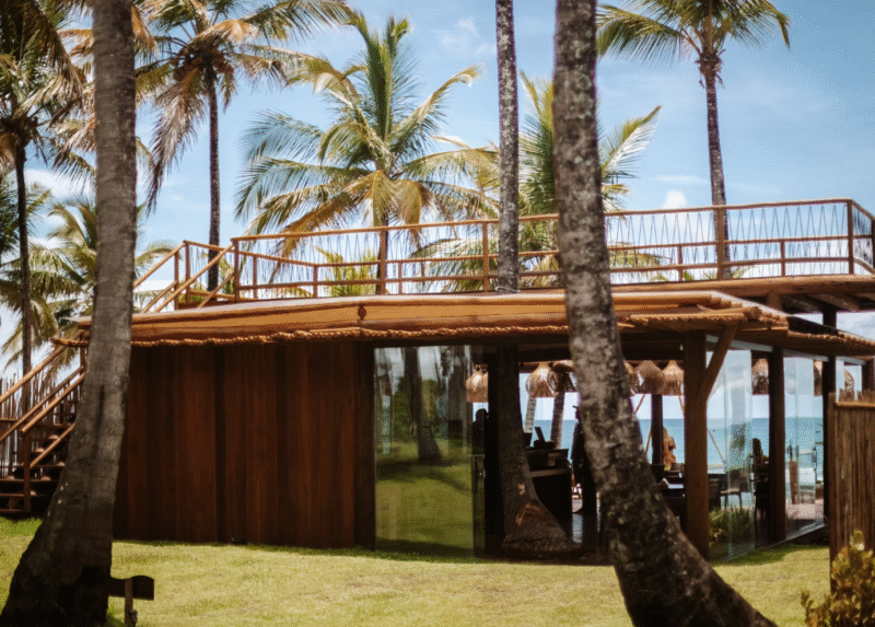 O projeto prioriza sustentabilidade: madeira reaproveitada, preservação de coqueiros e sistema ecológico de tratamento de esgoto fazem parte do conceito responsável do hotel.