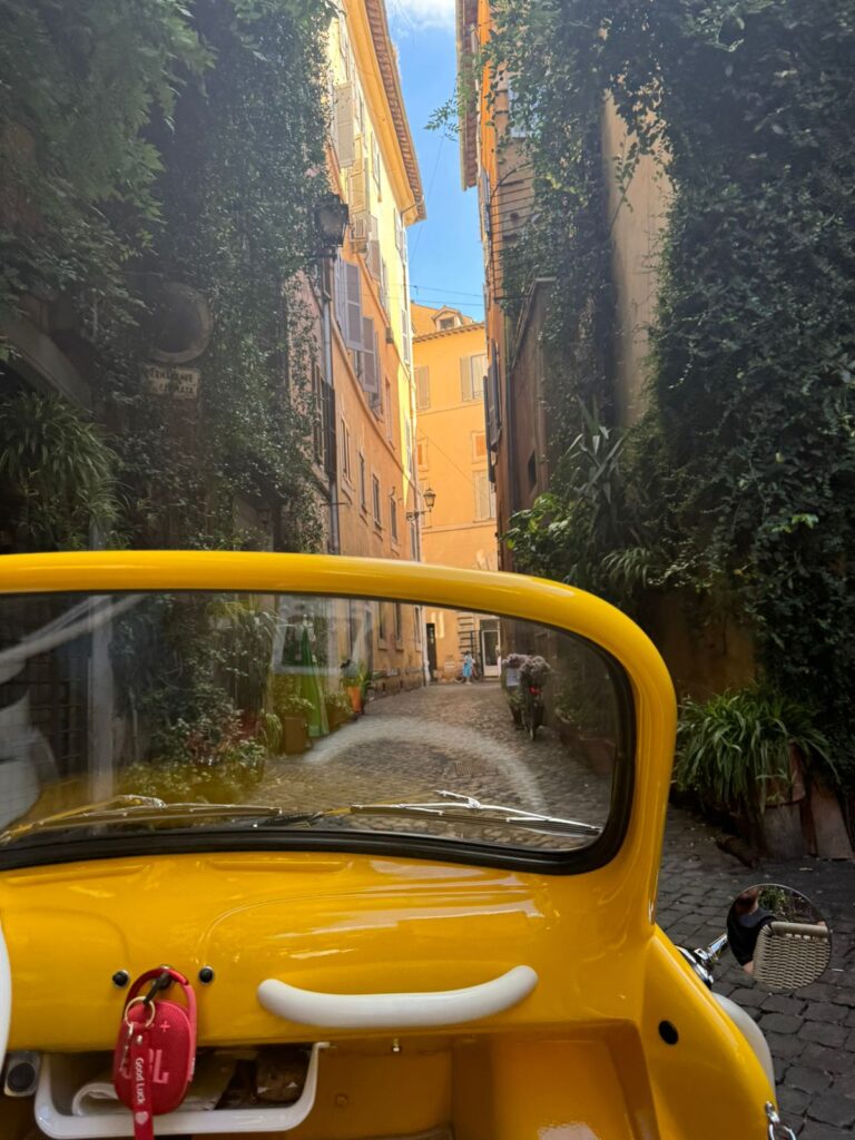 O grande protagonista da experiência é o carro: um modelo clássico de época, totalmente elétrico. A combinação entre o visual retrô e a mobilidade sustentável cria um contraste perfeito entre tradição e inovação. O veículo chama atenção por onde passa e oferece uma forma estilosa e eco-friendly de circular pelas ruas históricas de Roma, muitas delas acessíveis apenas para veículos autorizados.