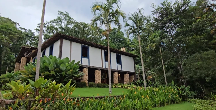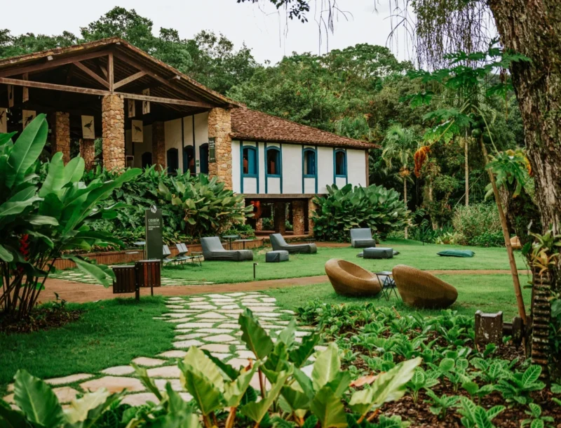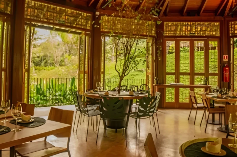 A arquitetura do restaurante se conecta completamente com a natureza: janelões amplos, mesas ao ar livre e espaços abertos que permitem contemplar a floresta em todos os detalhes. É um ambiente que traduz o espírito de Paraty, unindo simplicidade, autenticidade e sofisticação.